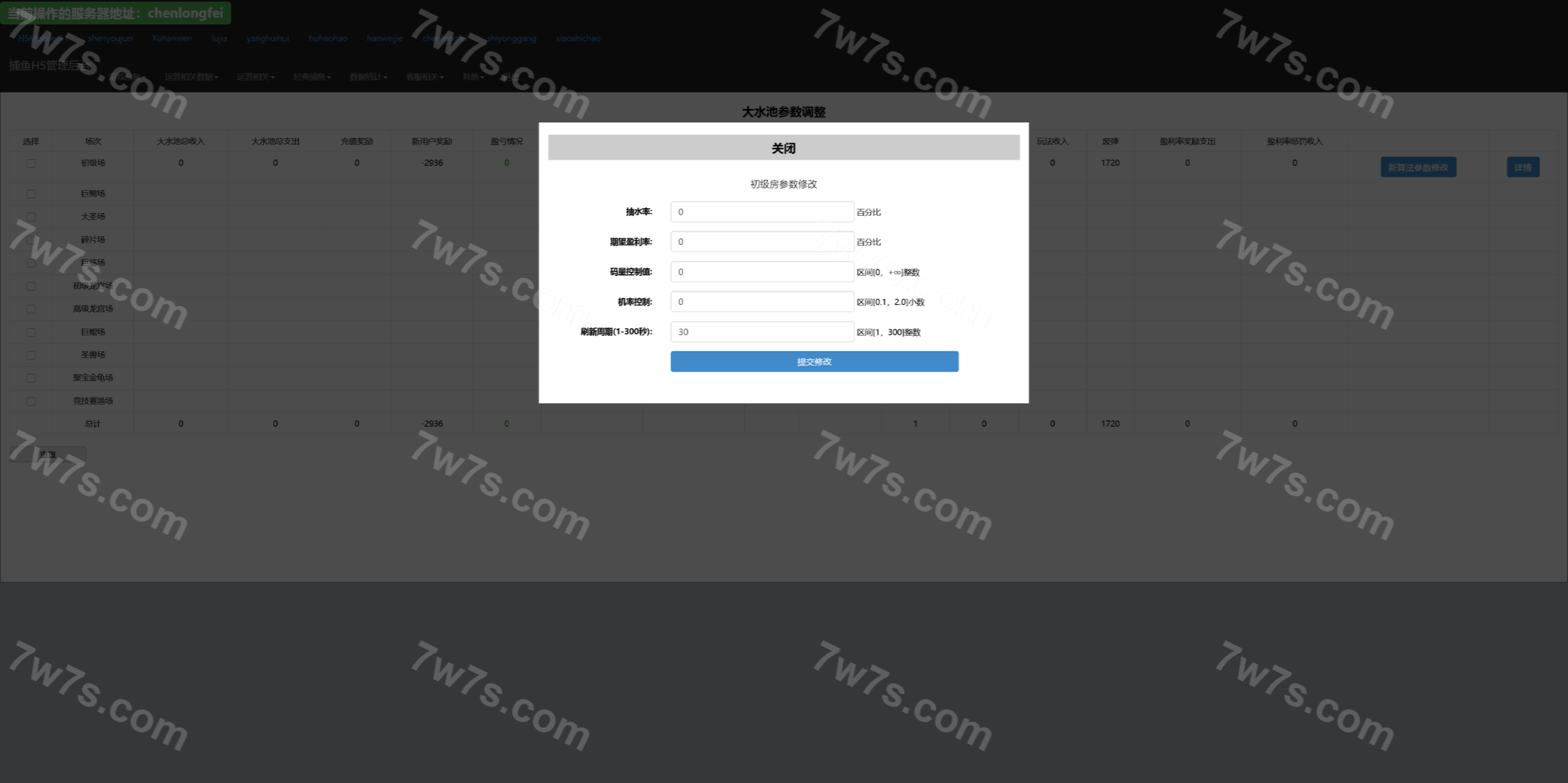 总管理后台可以针对每个渠道进行管理,网站源码中kufu是给渠道商的管理系统,控制系统分为全局参数控制、及账号点杀点送。其他的功能看上面的管理后台运行截图吧。