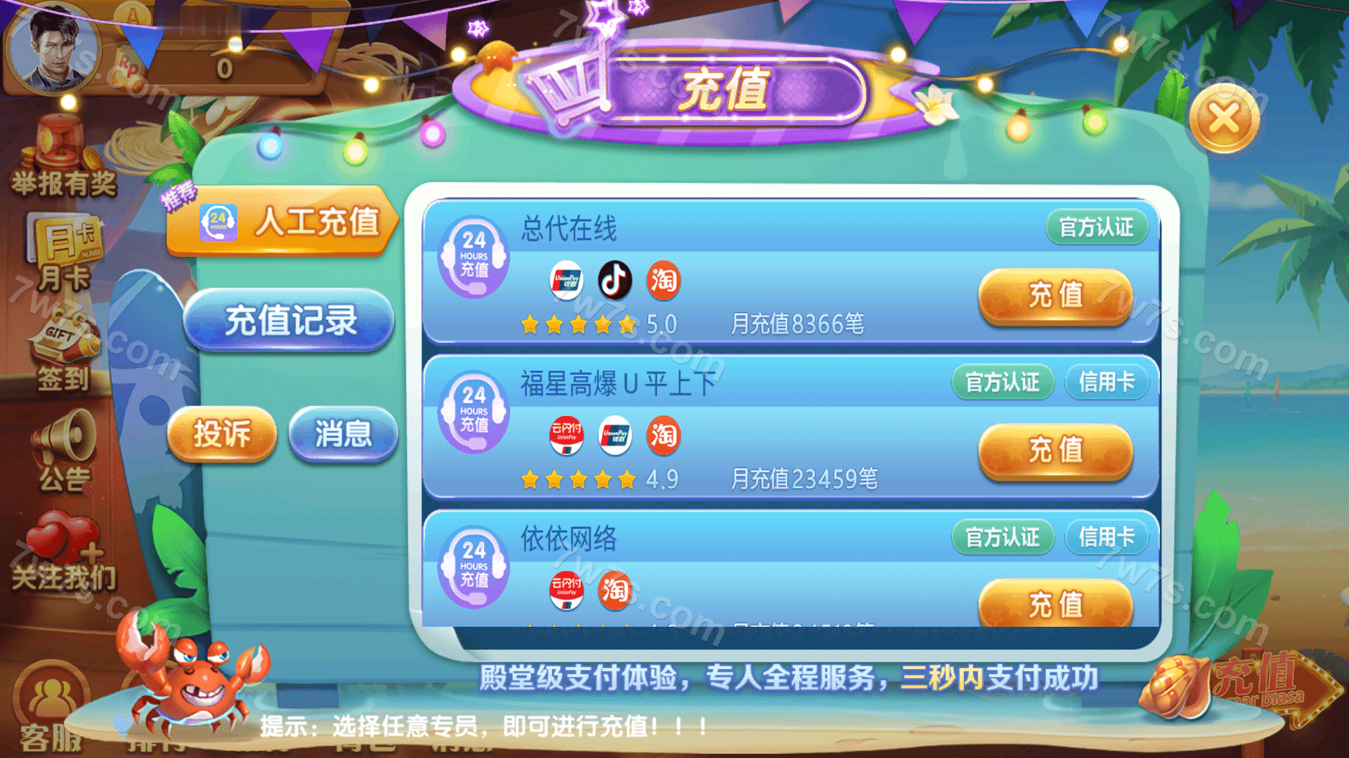 游戏分为多人,捕鱼,棋牌,电玩,休闲5个分类。看了下外面的正版63棋牌游戏运营了几年了,游戏相当不错。