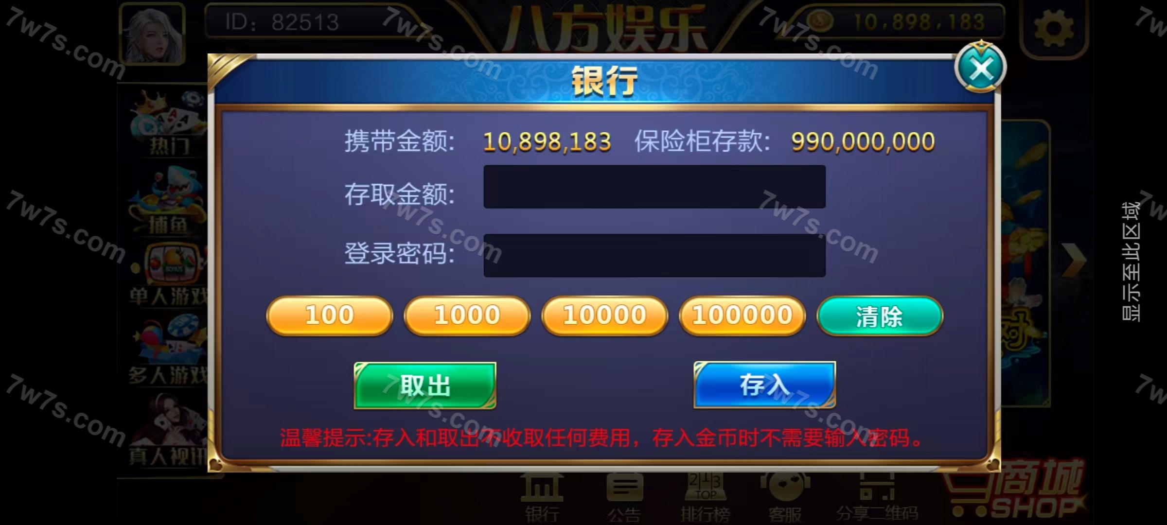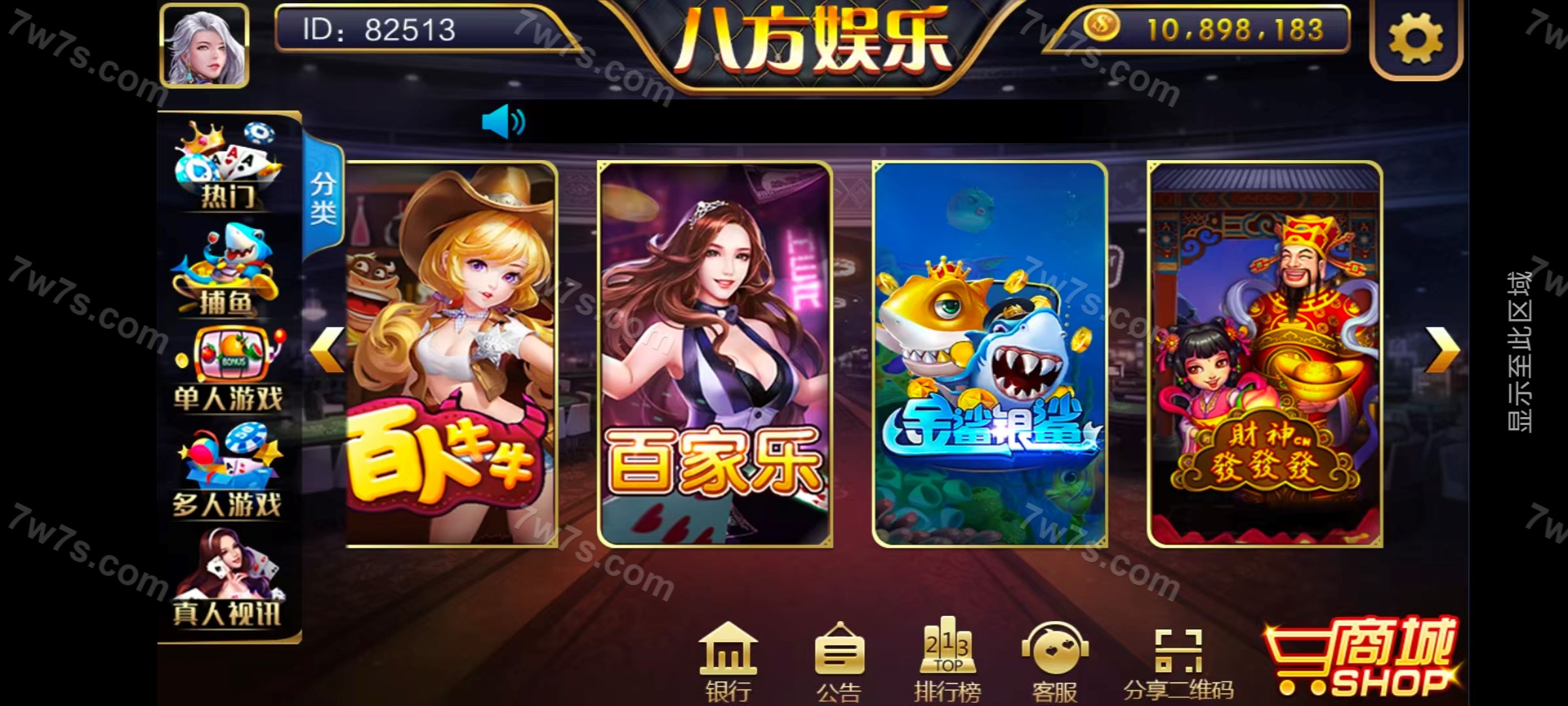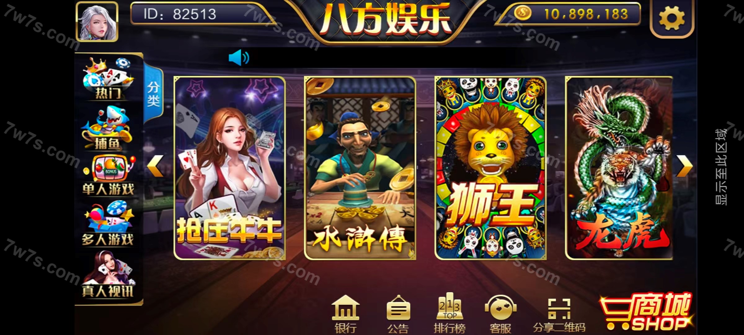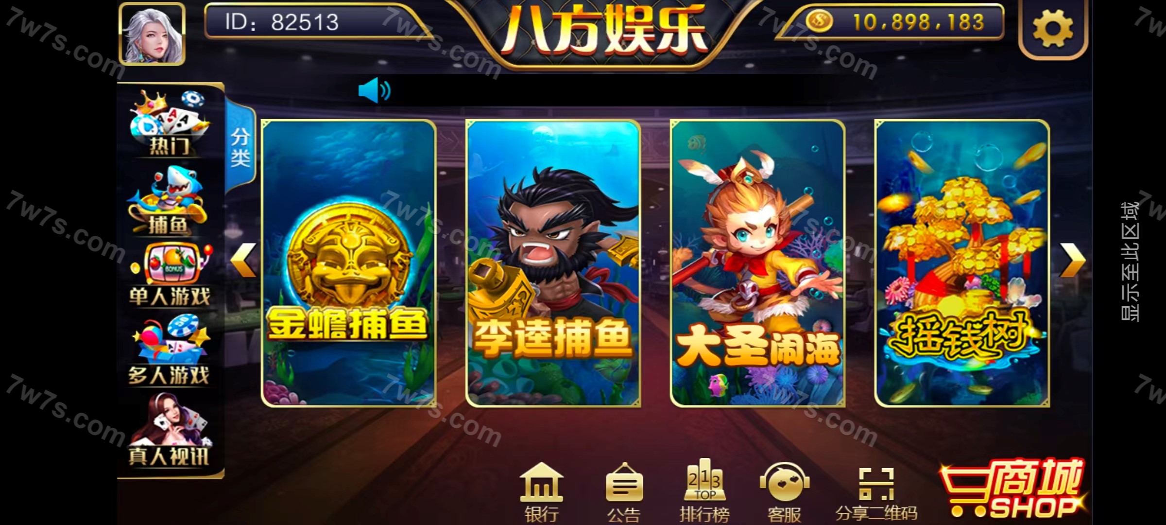 子游戏:金蟾捕鱼、李逵捕鱼、大圣闹海、摇钱树、抢庄牛牛、水浒传、狮王、龙虎斗、百人牛牛、百家乐、金鲨银鲨、财神发发发、经典水果机、五星宏辉。