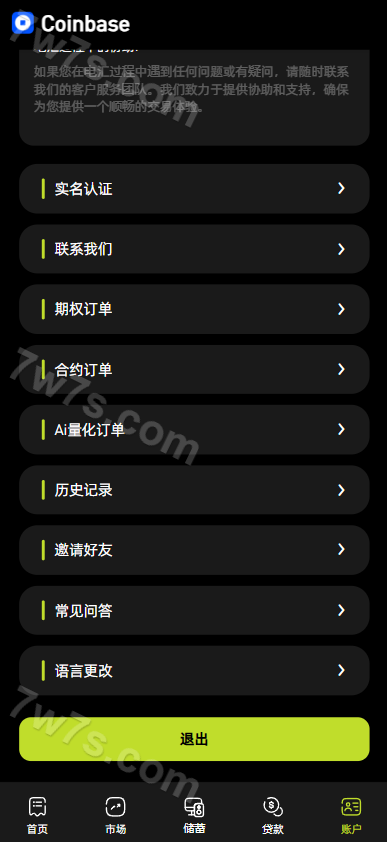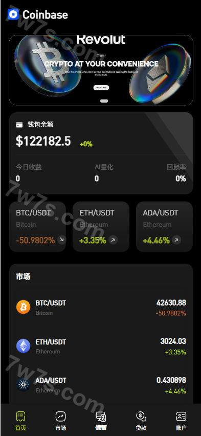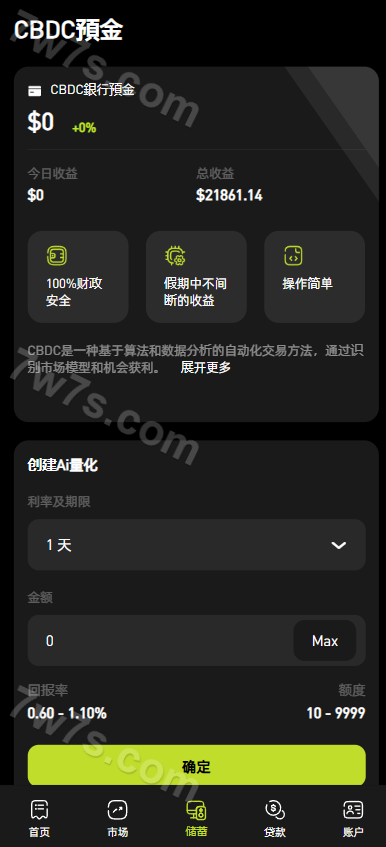 系统底部设有 “首页”“市场”“储蓄”“账户” 等导航栏,方便用户在不同功能板块间切换,如 “市场” 板块可查看各类金融产品行情,“储蓄” 板块涉及 AI 量化和 CBDC 预金,“账户” 板块管理钱包和资金操作。