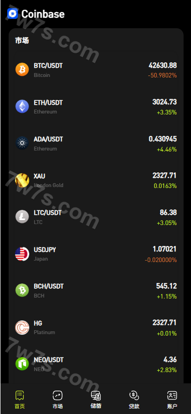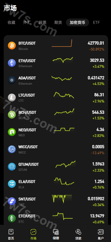 加密货币:支持(BTC)、(ETH)、ADA、LTC)等多种主流加密货币交易,可查看实时价格(如 BTC/USDT 价格波动)、涨跌幅度(绿色表示上涨、橙色表示下跌)及 K 线走势(如 BTC 的分时 K 线图,包含开盘、收盘价格,还可切换 1 分钟、5 分钟等不同时间周期)。