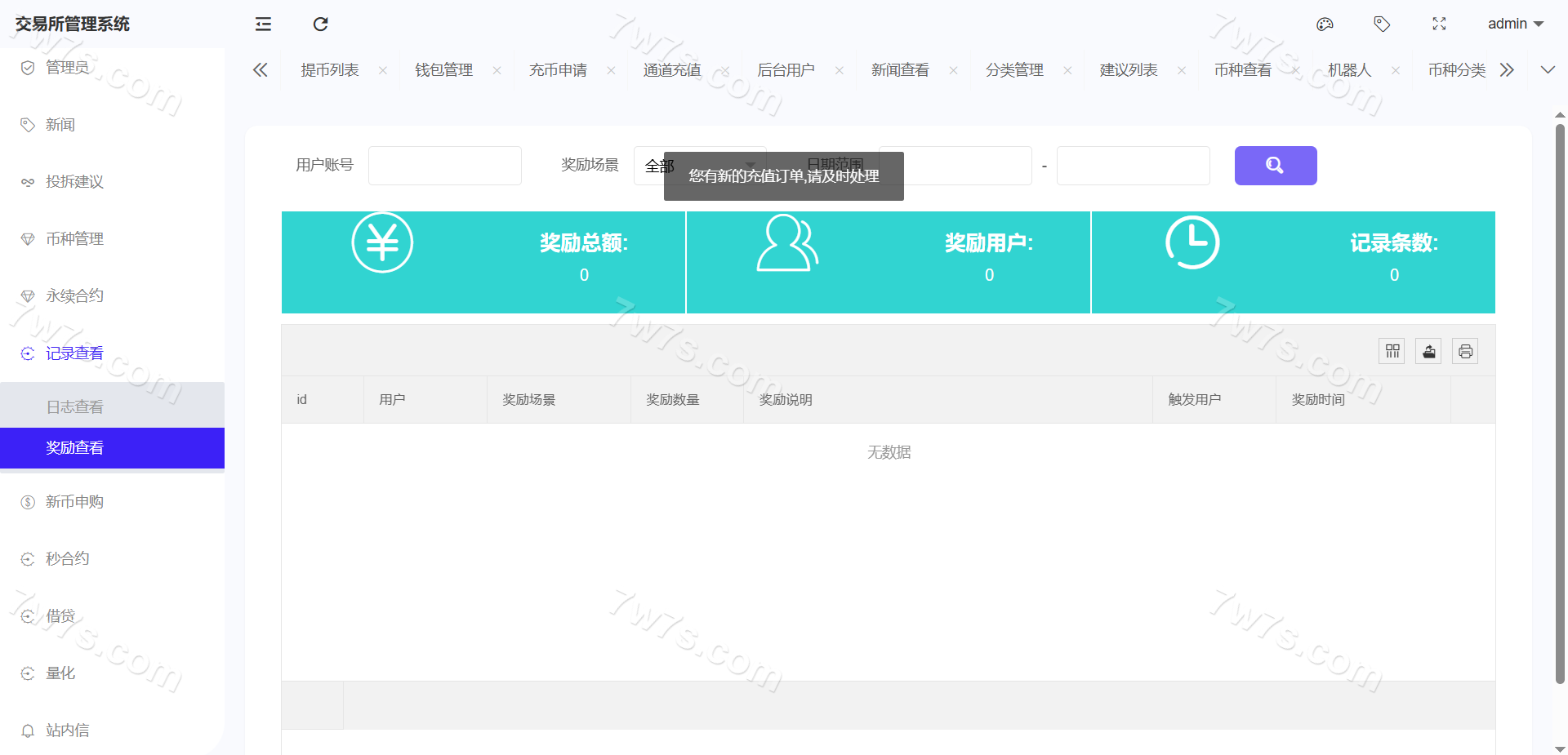 存款功能支持 USDT 存款,提供 ERC20 和 TRC20 两种链类型的选择,生成对应的存款二维码和钱包地址,方便用户进行资金充值。