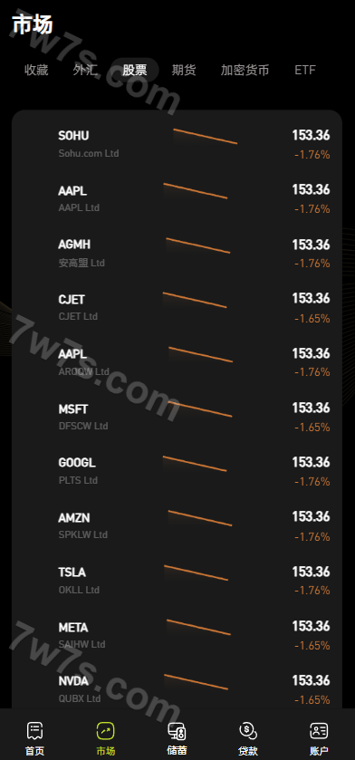 股票:涵盖搜狐(SOHU)、苹果(AAPL)、微软(MSFT)、谷歌(GOOGL)、亚马逊(AMZN)、Meta 等知名企业股票,显示股票代码、公司名称及涨跌幅(如 AAPL 上涨 3.20%)。