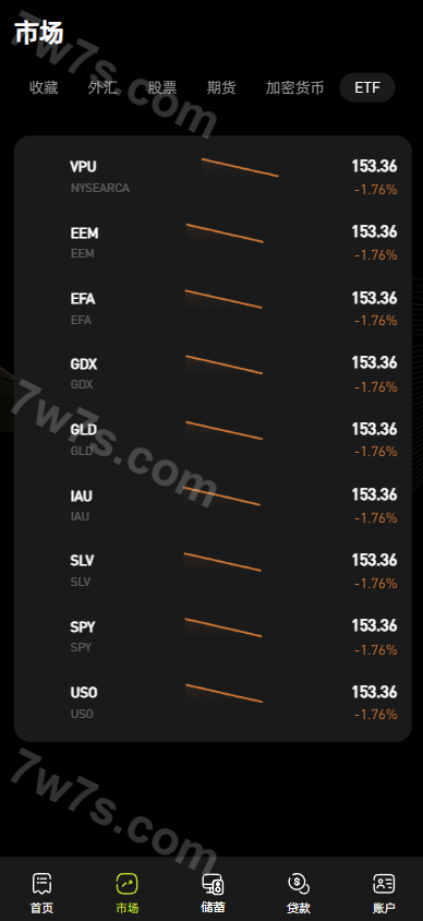ETF:包含 VPU、EEM、EFA、GDX 等 ETF 产品,同样展示价格和涨跌情况(如 VPU 上涨 0.54%)。