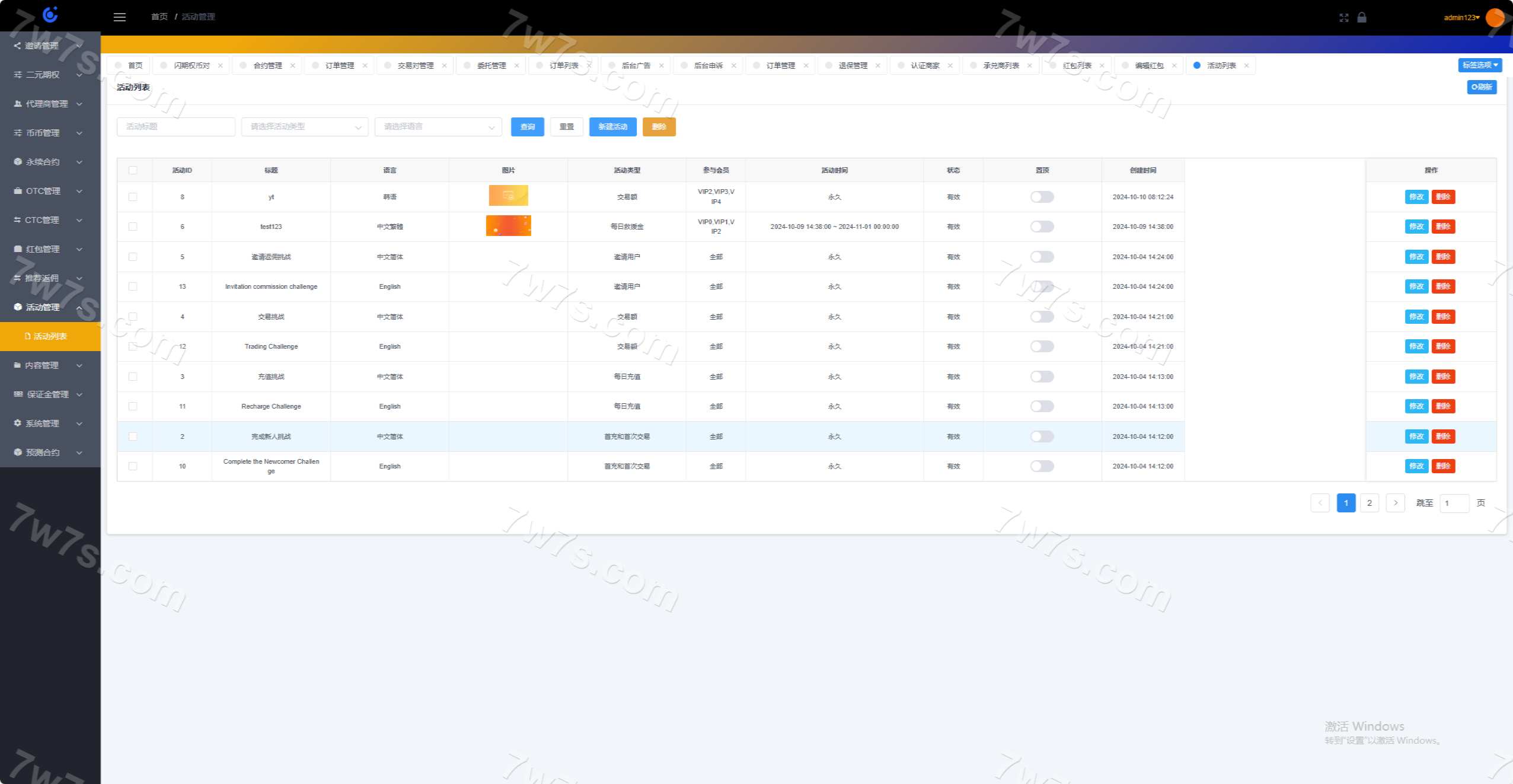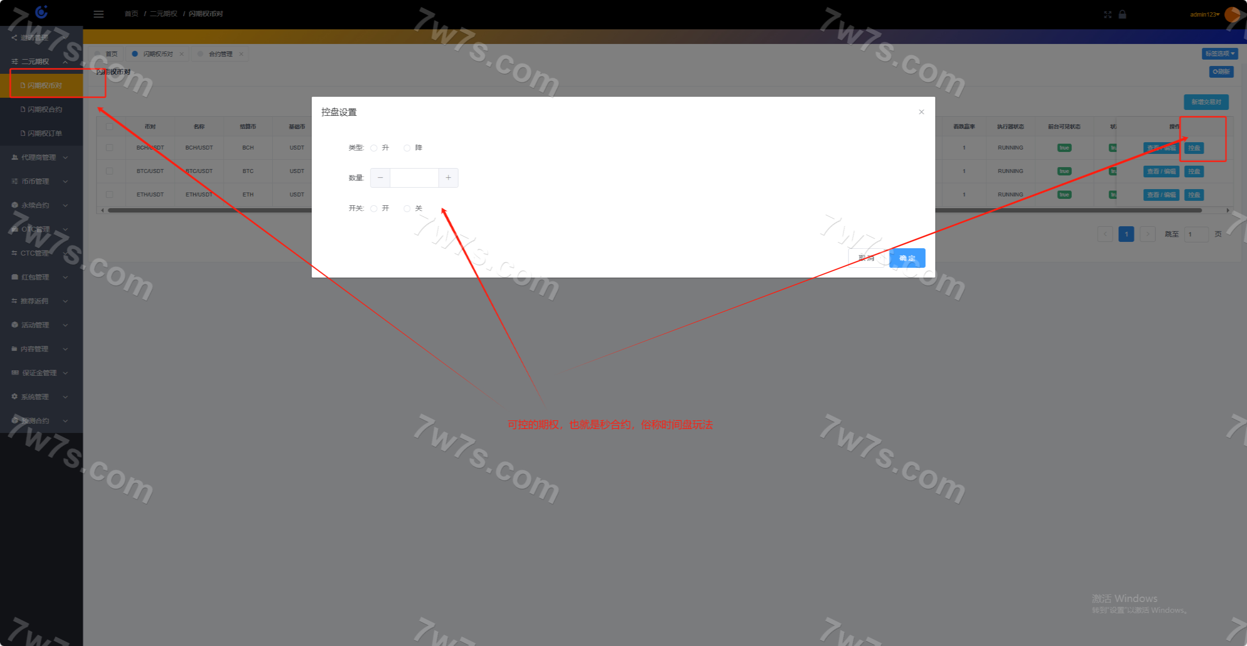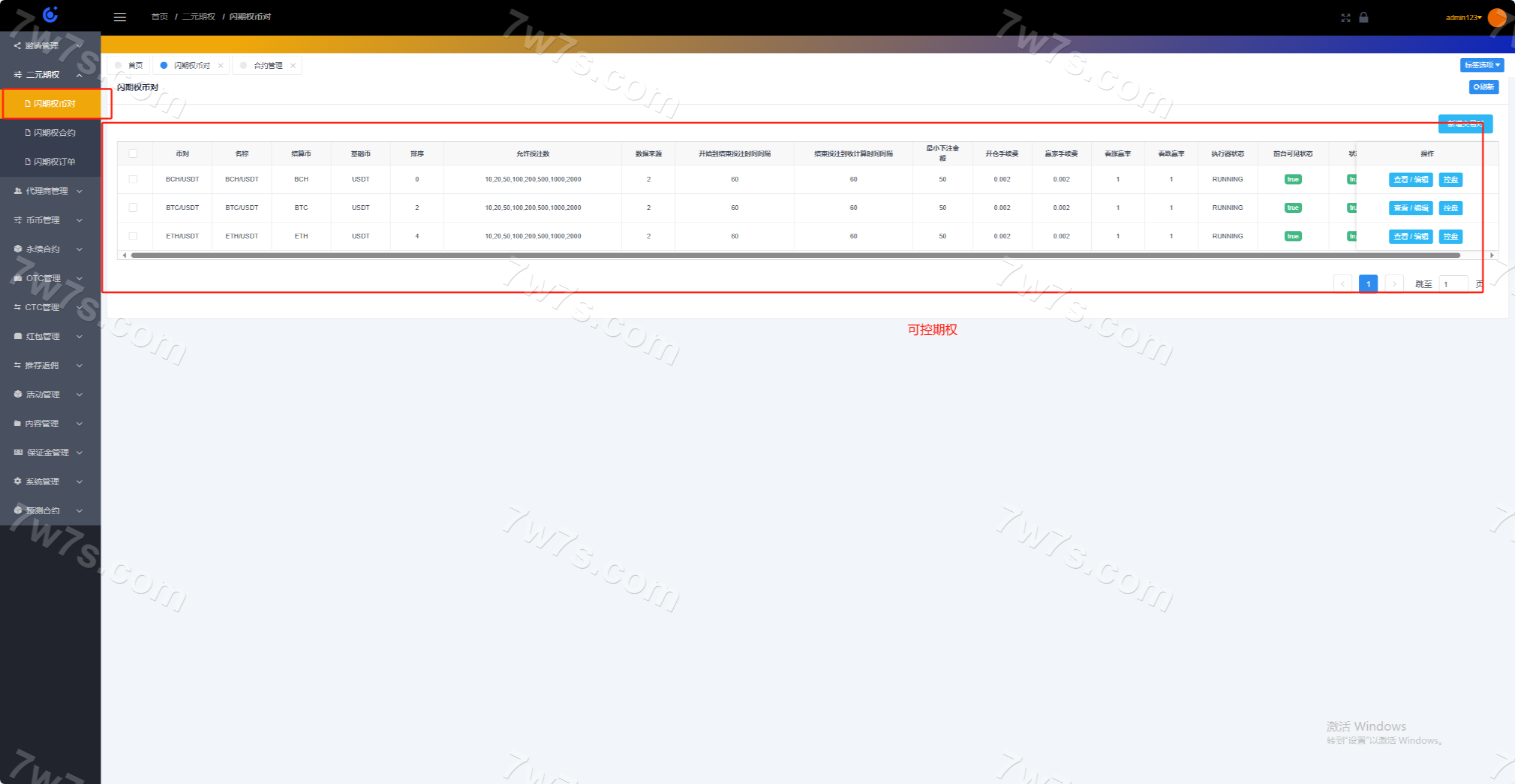 系统分为:永续、闪期权、交易撮合、市场行情、机器人、代理商系统、控盘系统;
