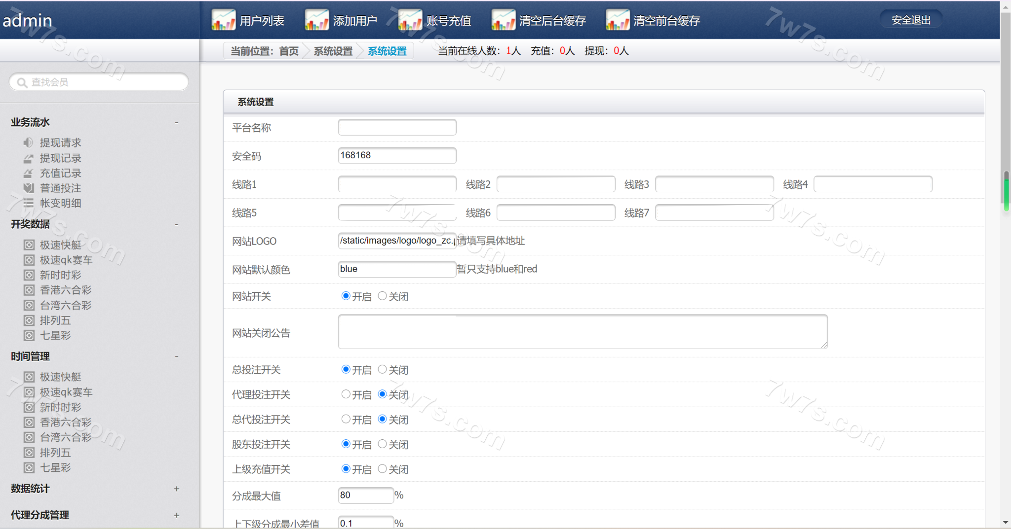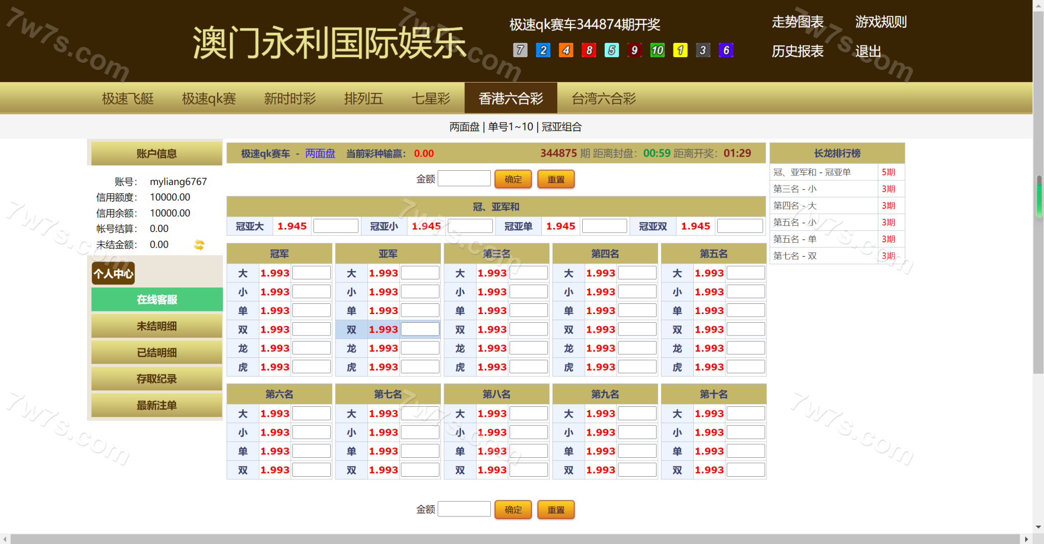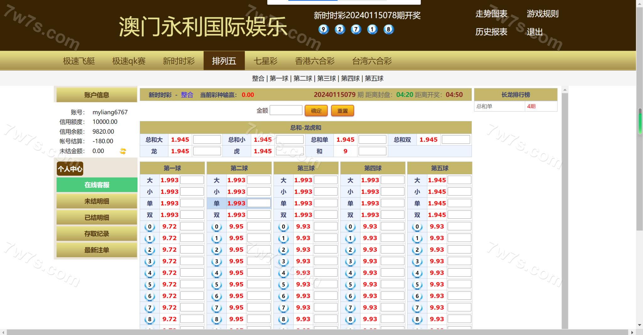 简约的前端,但是该有的功能还是有的,可以信用和现金盘两用,有七星彩、排列5、六合彩、赛车彩票,七星彩玩法一定二定等等