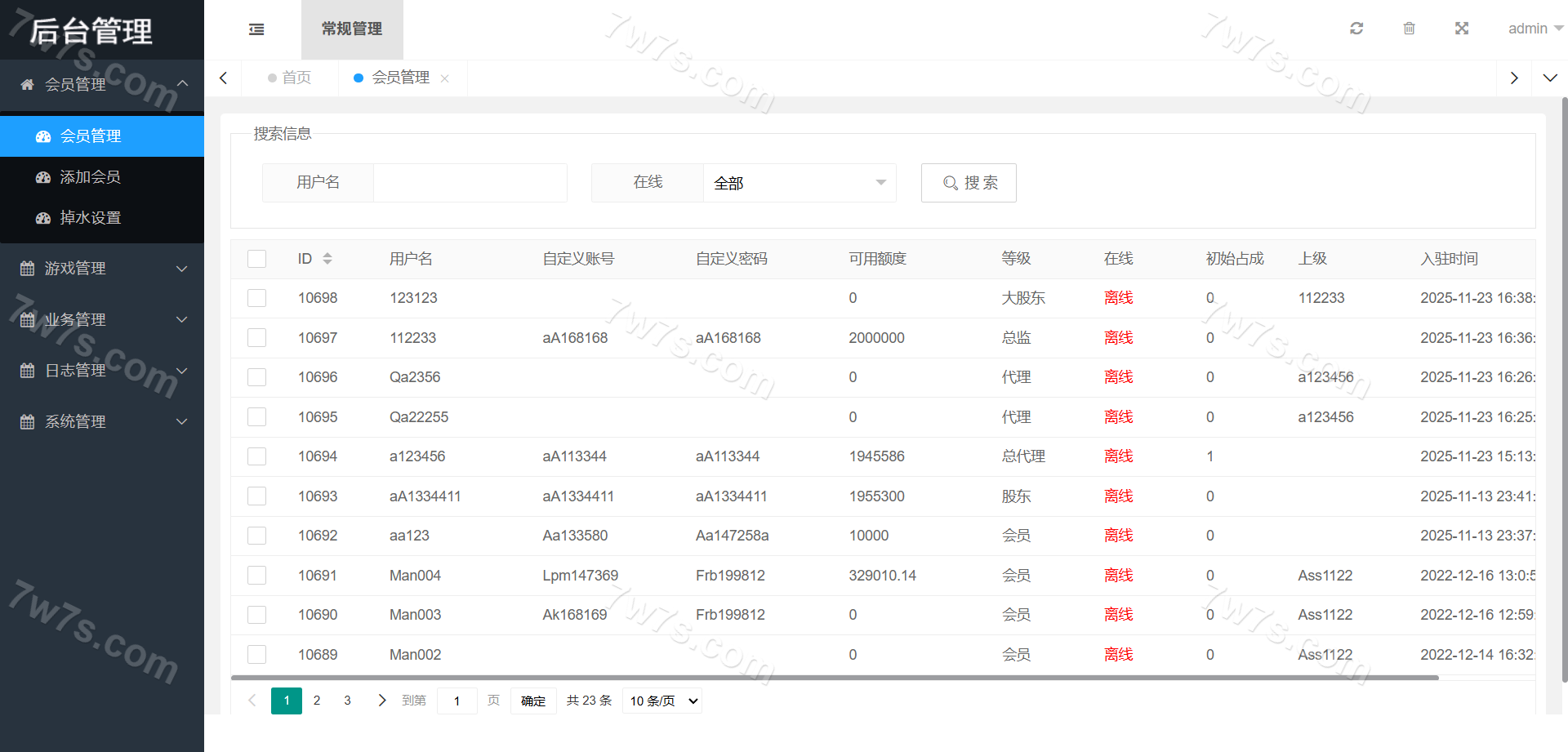 总管理员-公司-股东-大股东-总代理-代理-会员